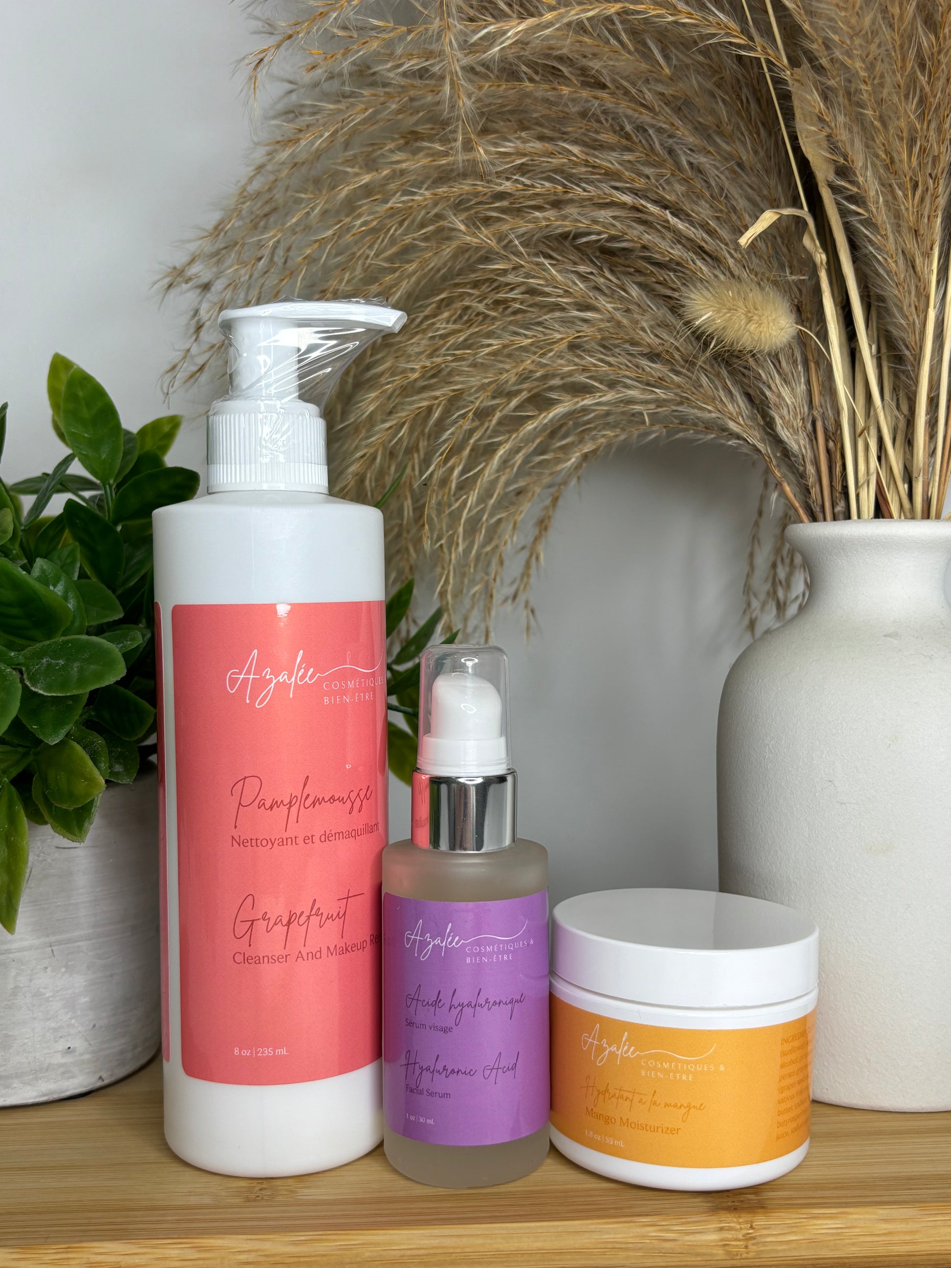 Le trio hydratant contient le nettoyant au pamplemousse de 235 ml, le sérum à l'acide hyaluronique de 30 ml et la crème hydratante à la mangue de 53 ml.