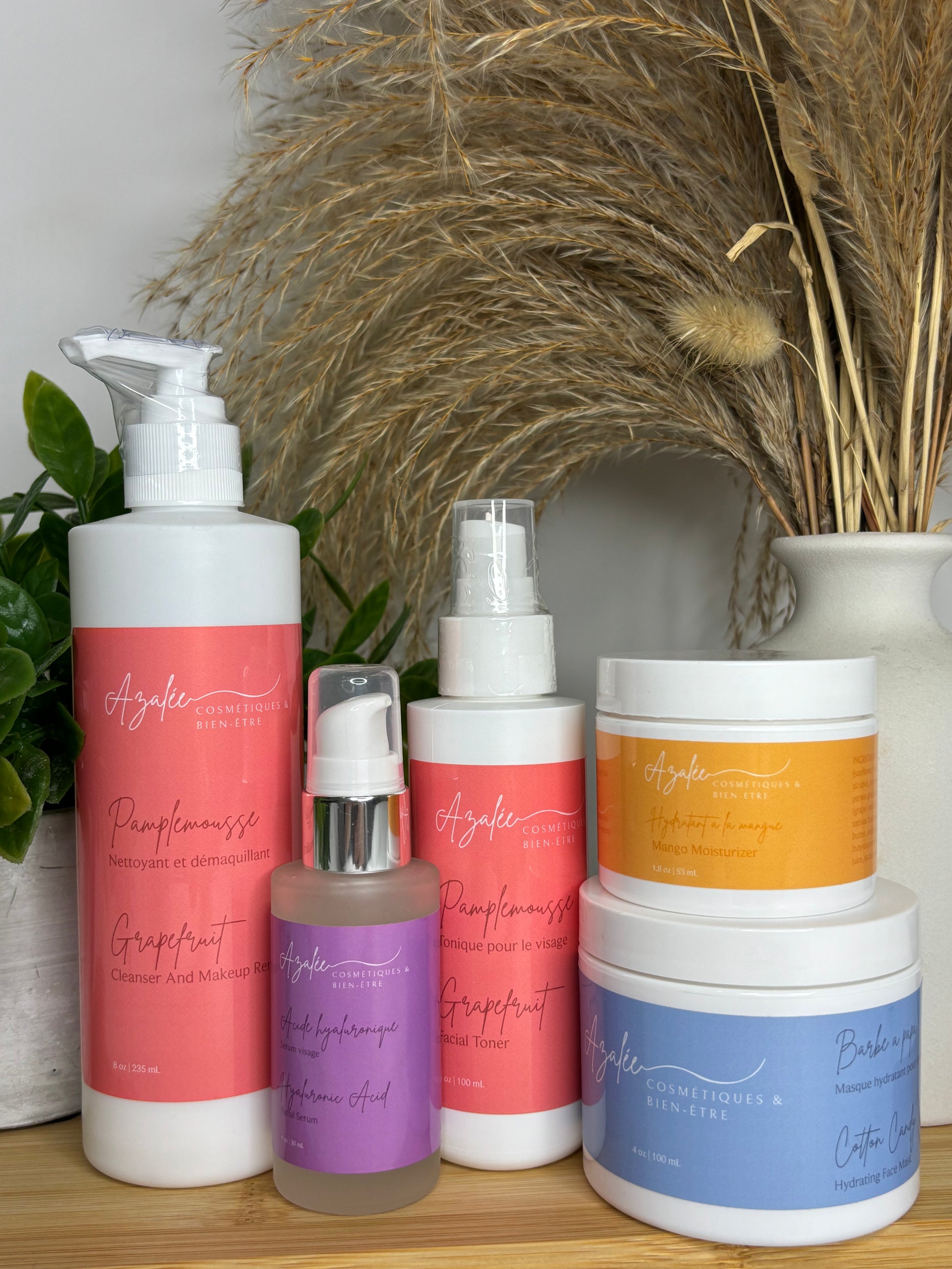 La routine complète contient le nettoyant au pamplemousse de 235ml, le tonique au pamplemousse de 100ml, le sérum à l'acide hyaluronique de 30ml, le masque hydratant à la barbe à papa de 100ml et la crème hydratante à la mangue de 53ml.