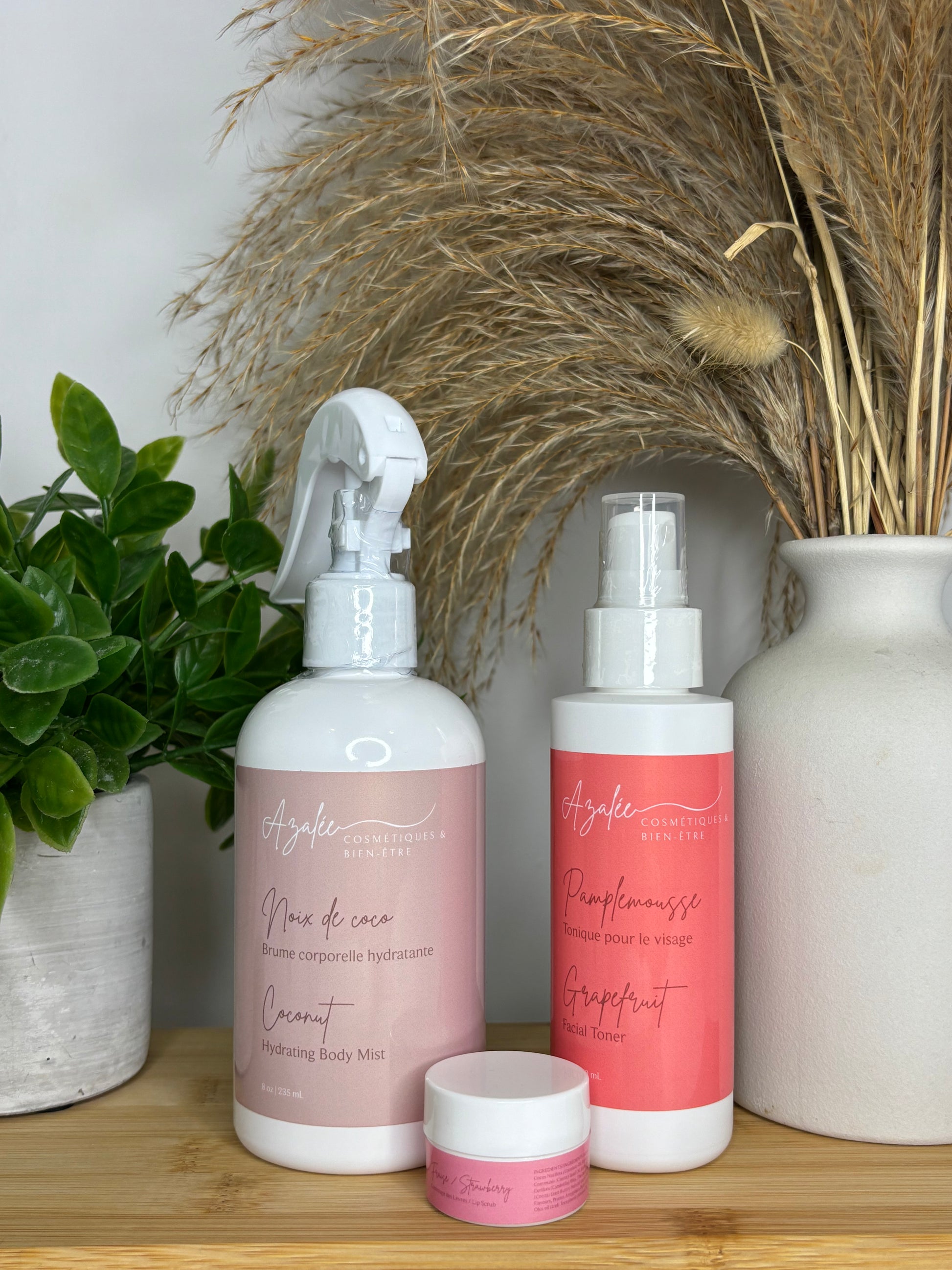 Ce combo hydratant contient la brume corporelle hydratante à la noix de coco de 235ml, le tonique au pamplemousse de 100ml et le gommage pour les lèvres à la fraise de 15ml.