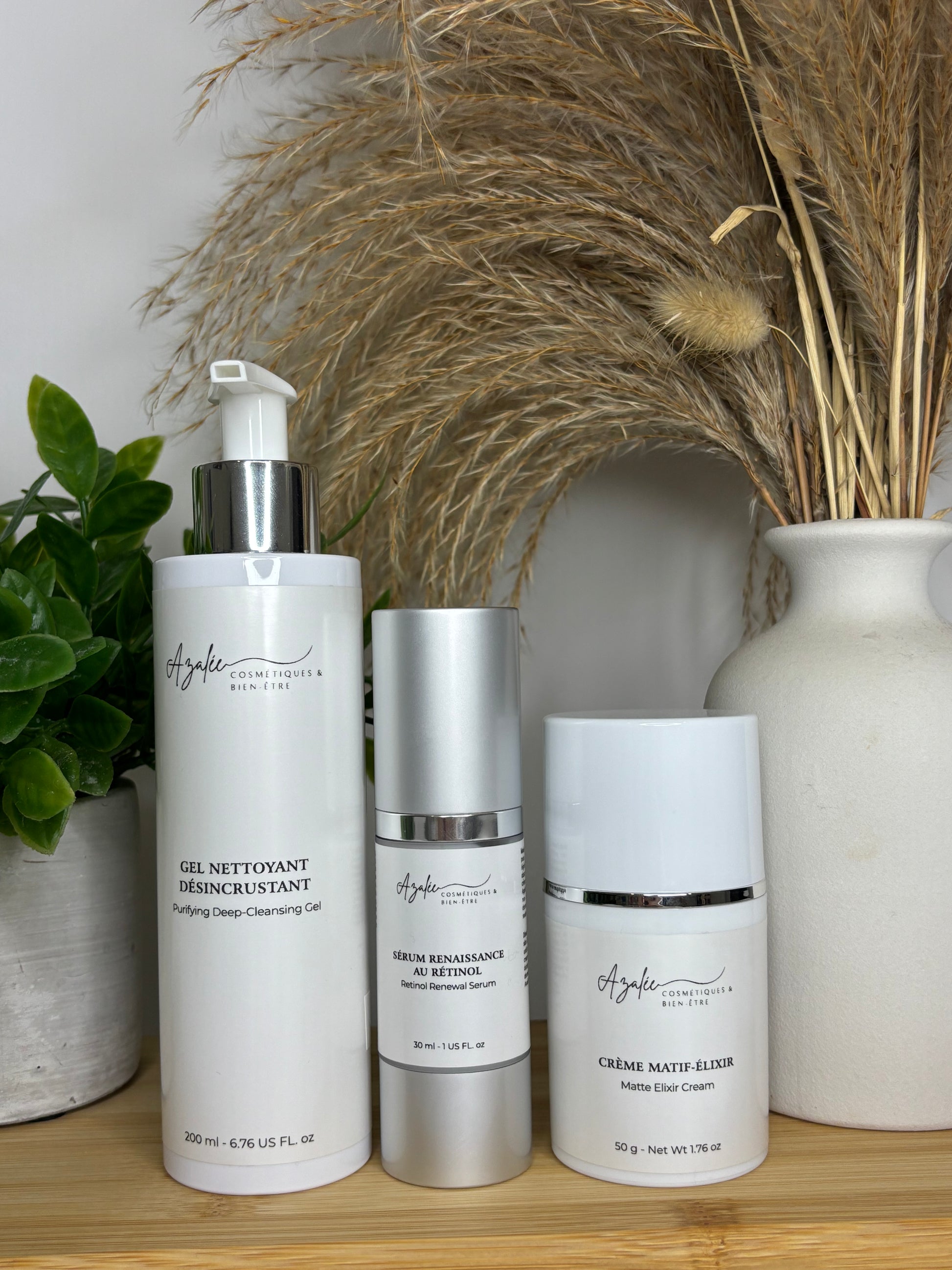 Ce trio purifiant contient le gel nettoyant désincrustant de 200ml, le sérum renaissance au rétinol de 30ml et la crème matif-élixir de 50g.