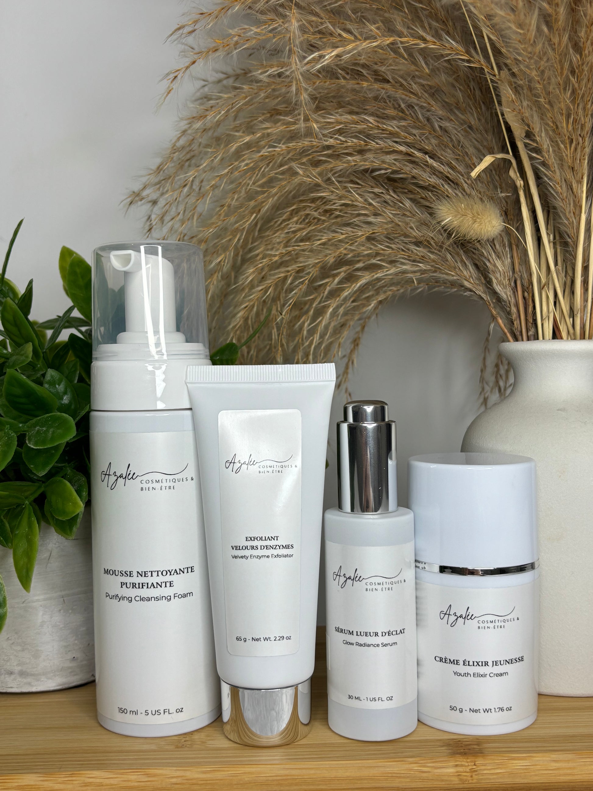 Ce combo anti-âge contient la mousse nettoyante purifiante de 150ml, l'exfoliant velours d'enzymes de 65g, le sérum lueur d'éclat de 30ml et la crème élixir jeunesse de 50g.